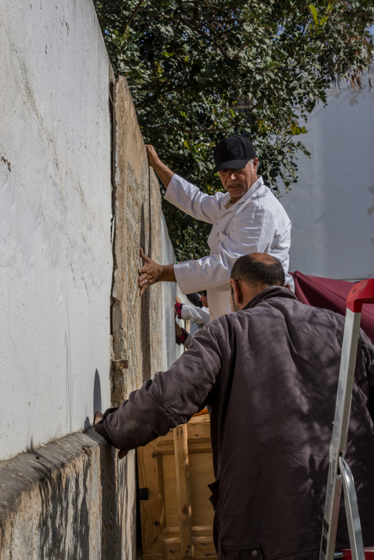 C’est l’étape qui permet de décrocher les mosaïques de leur socle actuel, dans l’ancien musée. Les équipes de techniciens sécurisent la mosaïque avec une gaze de coton collée sur les tesselles. Ils décrochent les mosaïques avec leur support et les descendent au sol.