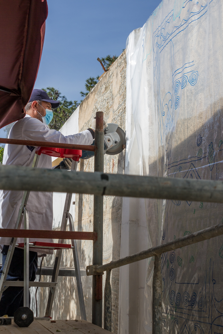 La gaze de coton sécurisant la mosaïque est enlevée et la colle réversible éliminée à l’eau. Les tesselles sont nettoyées mécaniquement pour rendre aux œuvres tout leur éclat.  Quelques tesselles manquantes peuvent être remplacées mais on ne reconstitue plus les lacunes, comme on le faisait avant.